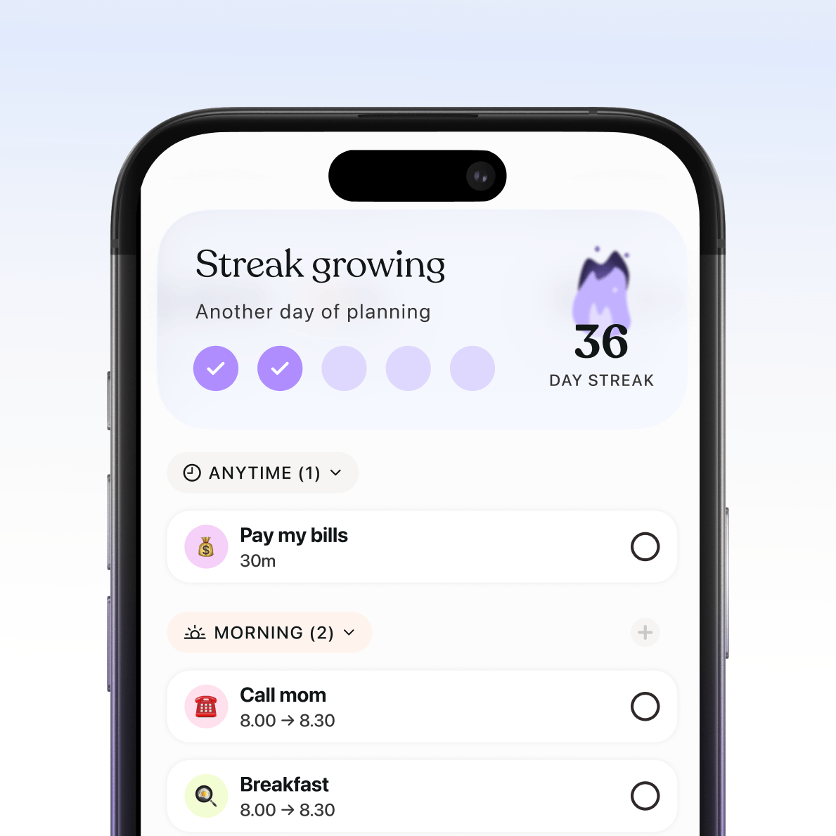 Streaks make your progress visible and meaningful. Every session you show up in Tiimo and every task you complete earns you trophies. It makes your consistency tangible and rewarding.