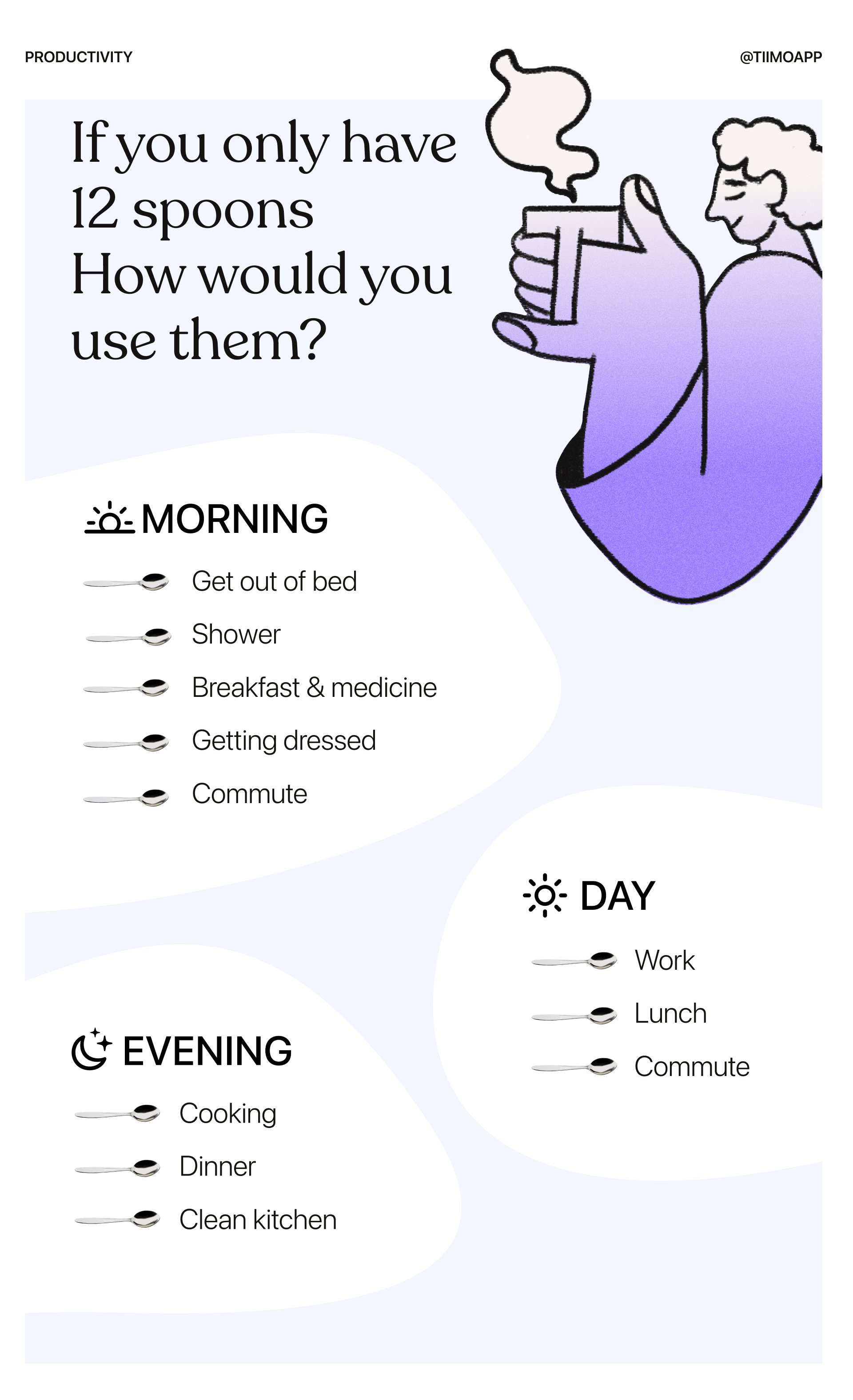 Then the energy mapping begins. Tell yourself that you have only 12 spoons, and you have to decide how to use them throughout the day.